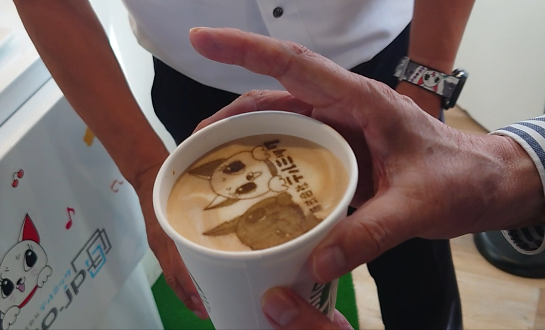 田中社長と、ロボットが入れてくれるエスプレッソマシン