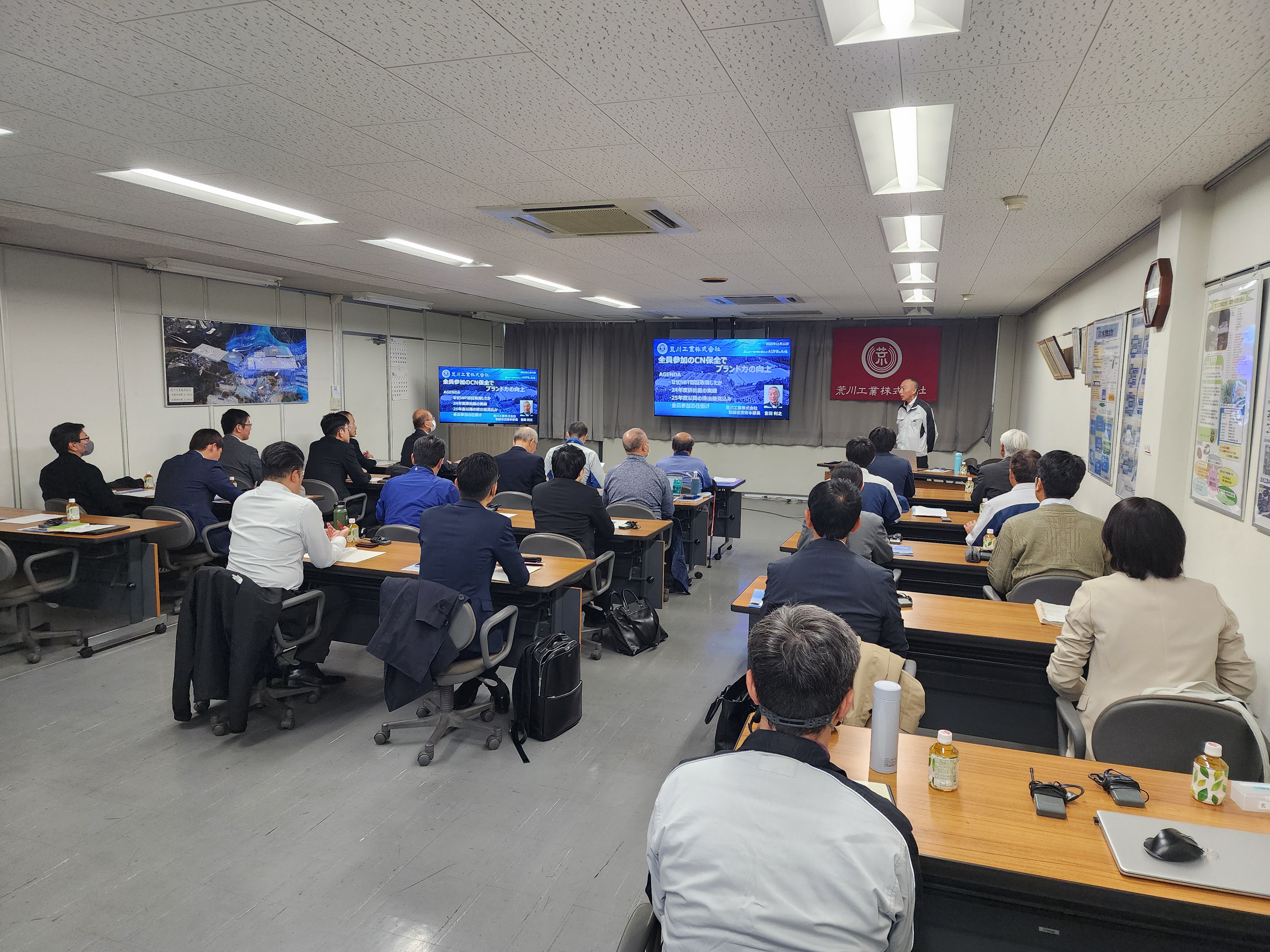 荒川工業が取り組むカーボンニュートラル活動「全員参加のCN保全」について説明するしている