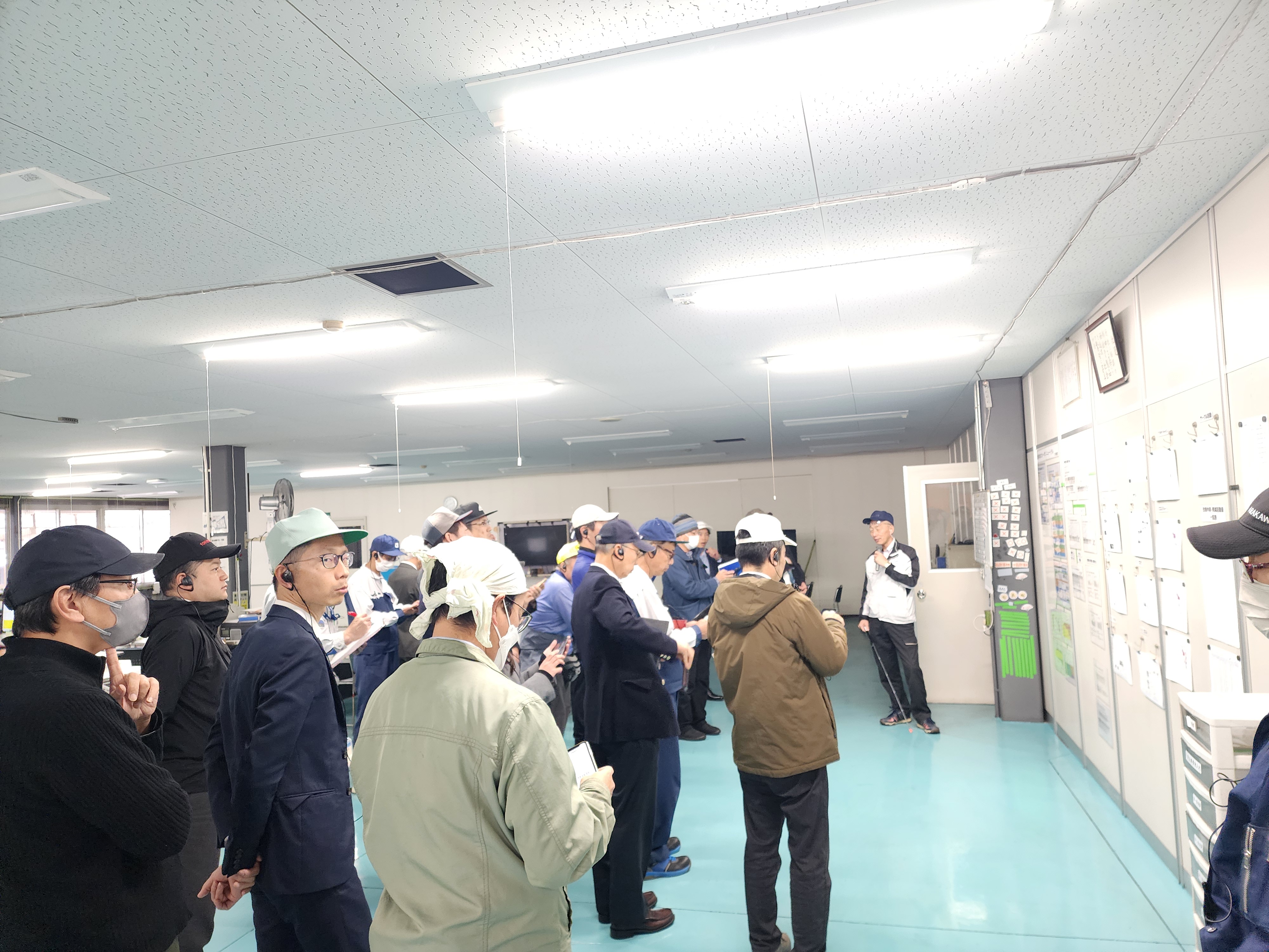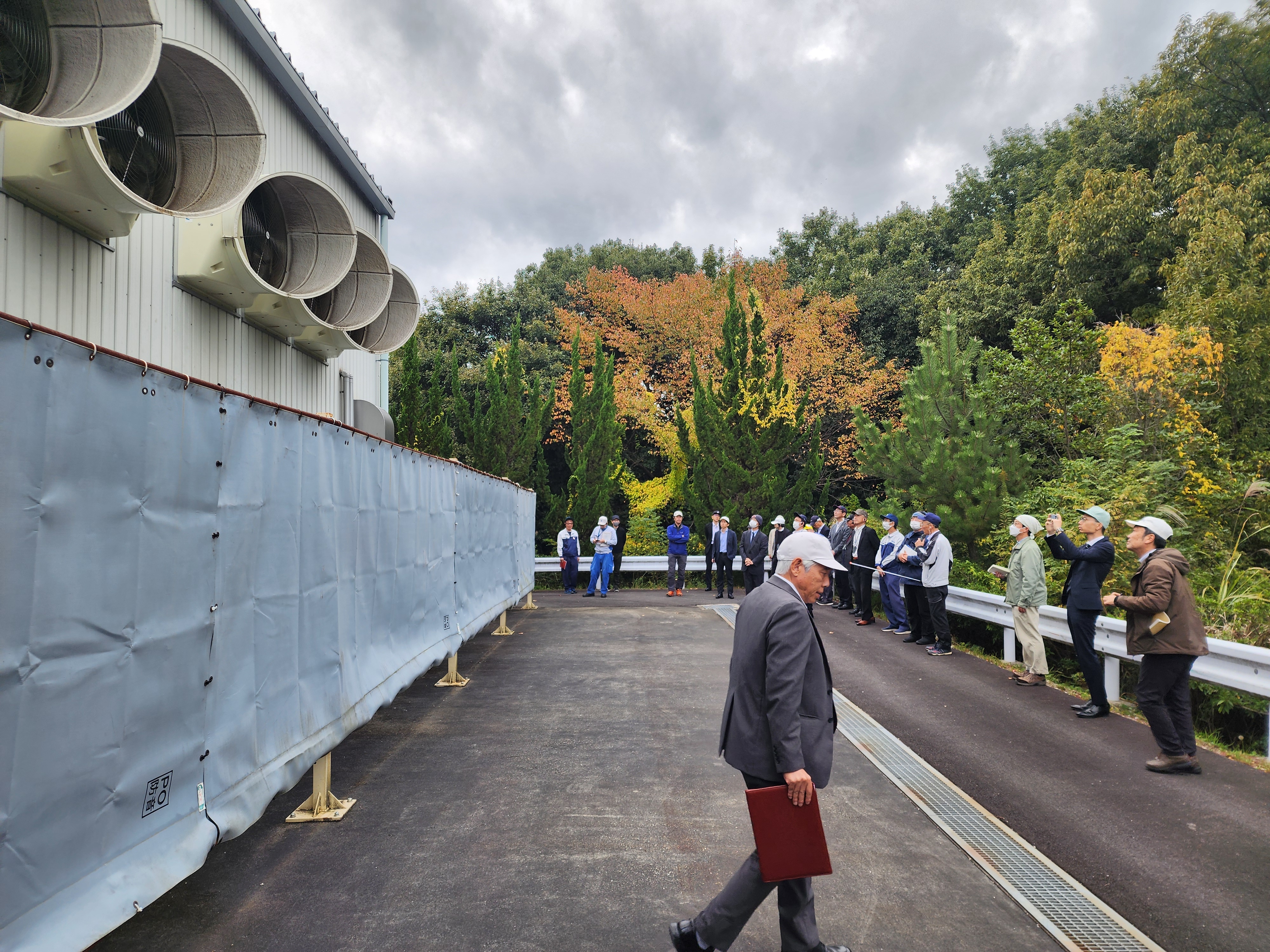 サークル活動など取り組みを説明している様子(左)夏場の工場内環境を改善するために取り付けた大型換気扇(右)