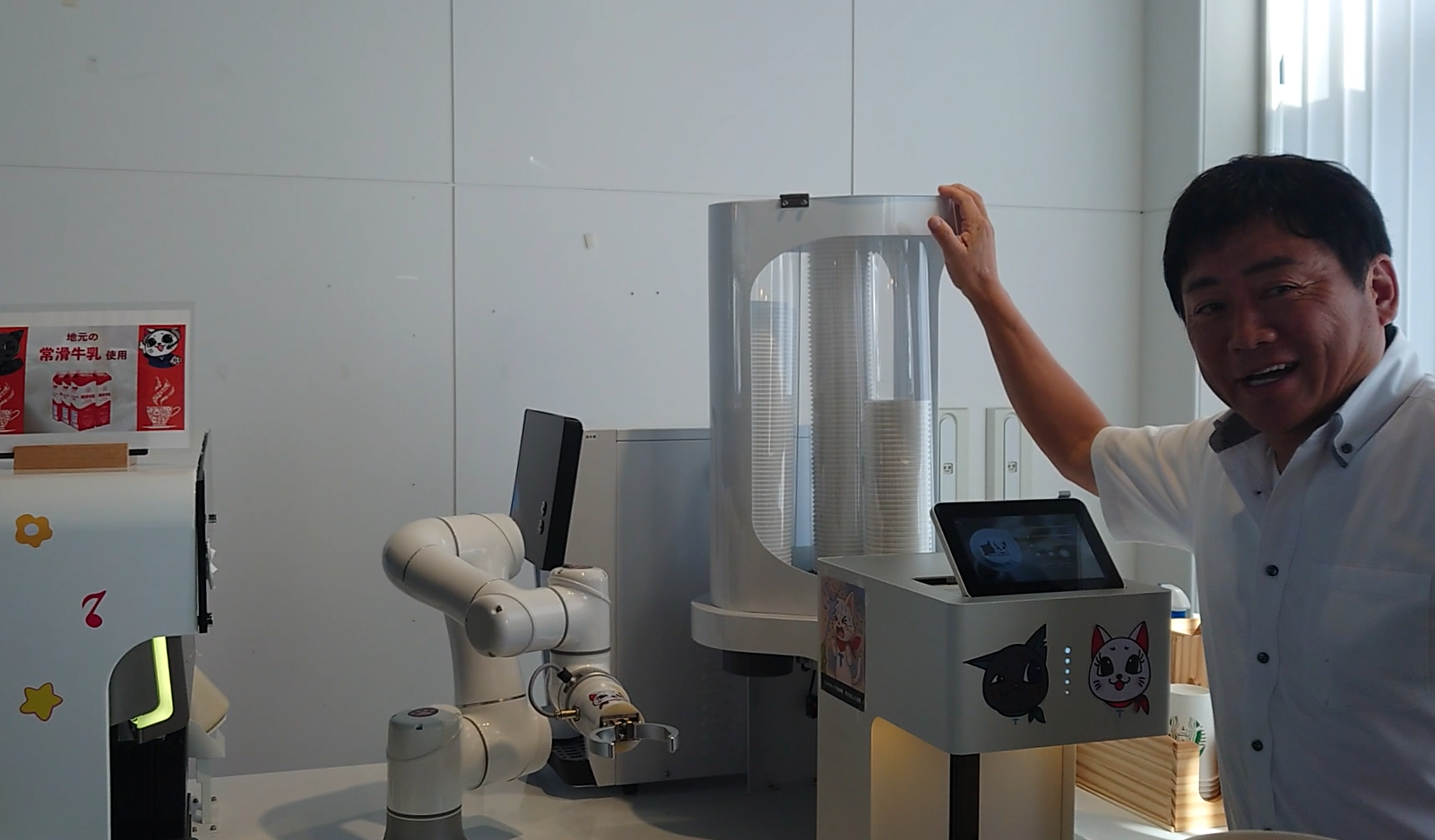 田中社長と、ロボットが入れてくれるエスプレッソマシン